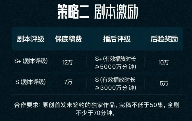首先说剧本,当然最重要的标准是【原创首发未签约的独家作品】,满足条件并且在腾讯平台获得S+、S剧本评级,就可以获得2份钱,保底稿费+后验奖励。如果有实力,最高能获得22万的剧本激励!对于扎实研究原创剧本的公司或者个人,这都是天大的好消息。