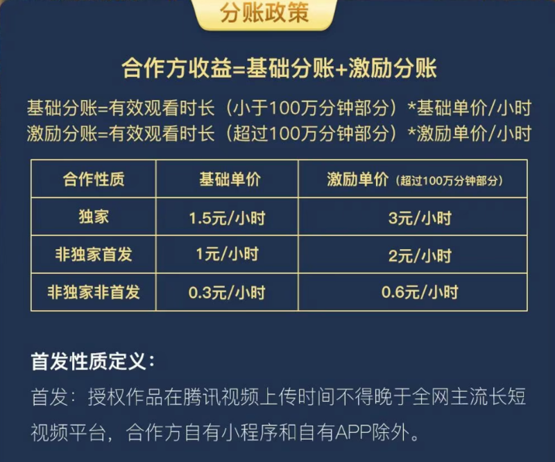 这已经是腾讯视频今年第三次,对竖屏短剧升级合作政策和激励。细看这次的调整,其实分账还是延续5月30日的基础分账+激励分账的计算规则,对独家、非独家首发和非独家非首发三种合作性质的内容进行阶梯价格管理。