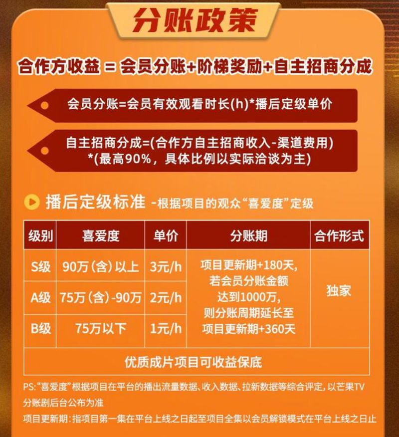 芒果的微短剧激励最近一次更新是在2025年2月。除了常规的会员分账+阶梯奖励外,还引入了自主招商分成这一指标。