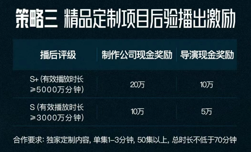 其次是制作公司和导演,竖屏独家定制短剧播后评级为S+、S的短剧,制作公司最高能领20万,导演最高能领10万!横屏短剧以制作公司厂牌为单位,凡是上线三部(以上)赌博作品,按分账金额分阶梯给导演、编剧、IP方奖励,最高100万。