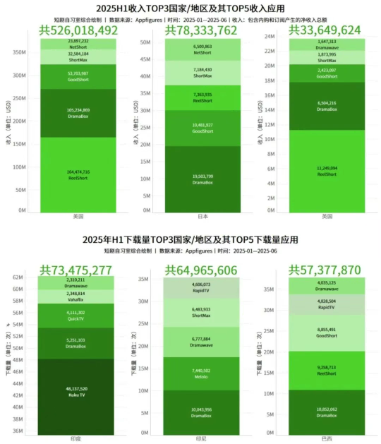 短剧市场的 “火热” 态势,首先源于其宏观规模的持续高速增长。根据《2025海外短剧行业报告(上半年)》的数据,今年上半年,海外短剧市场的总营收已突破10.88亿美元;预计全年营收将攀升至24.73亿美元,总下载量也有望达到12.09亿次。更有预测表明,到2027年,海外短剧市场规模将增长至187亿美元(约合1330亿元人民币),并且会实现对国内市场的超越。从整体来看,这一市场仍处于快速成长阶段,远未触及天花板。