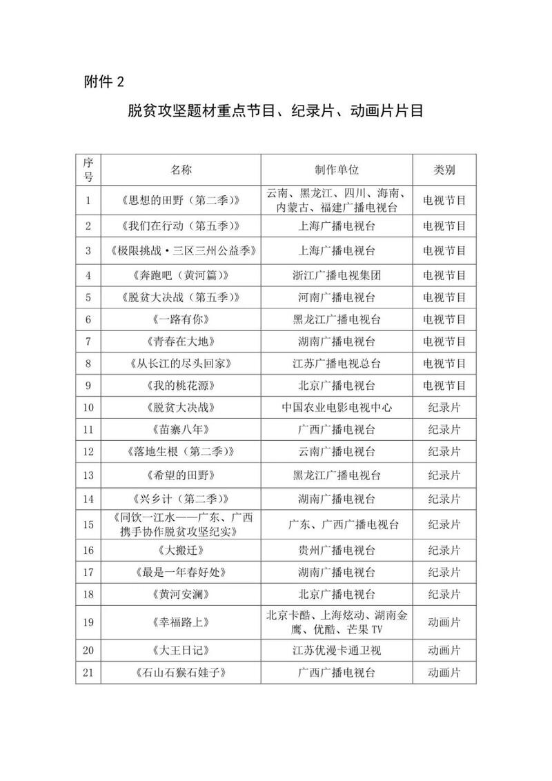 广播电视新闻、文艺、纪录片、动画片等各类作品要进一步加强联动、形成声势,持续深入宣传习近平总书记关于脱贫攻坚的重要论述、党中央脱贫攻坚决策部署、各地脱贫攻坚取得的重大成就和典型经验,用生动的形式讲好脱贫攻坚故事,用群众喜闻乐见的方式推动脱贫攻坚宣传往实处走、往深里走、往心里走。要在脱贫攻坚作品创作冲刺阶段进一步强化精品意识,更加精益求精,把好政治关、艺术关、技术关,用心用情用功,力争推出重量级、标杆性作品。广电总局确定了《极限挑战·三区三州公益季》《我们在行动(第五季)》《奔跑吧(黄河篇)》《脱贫大决战》《落地生根(第二季)》《幸福路上》等脱贫攻坚重点广播电视节目、纪录片、动画片(片目附后),相关单位要抓紧推进完成,已完成的要及时做好排播,并加大播出频次力度,为坚决打赢脱贫攻坚战提供强大精神动力。