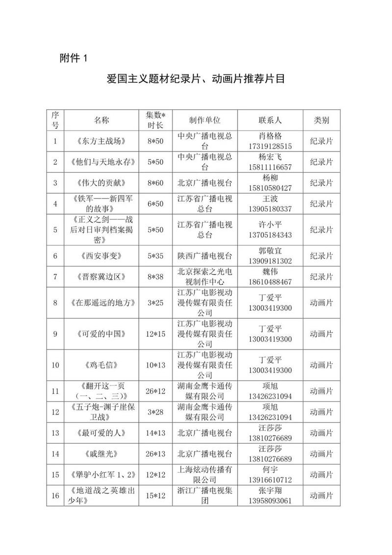 纪念中国人民抗日战争暨世界反法西斯战争胜利75周年、纪念中国人民志愿军抗美援朝出国作战70周年是今年党和国家重大活动。各级广播电视播出机构要抓住重要契机,深入开展爱国主义教育,精心编排播出一批反映抗日战争、抗美援朝伟大历程,展现伟大的抗战精神、伟大的抗美援朝精神,具有较高思想艺术水准的节目、纪录片、动画片,引导广大群众永远铭记历史、缅怀先烈、珍爱和平。广电总局从近年来创作的爱国主义题材纪录片、动画片中选择了《东方主战场》《最可爱的人》等一批优秀作品(片目附后),各级广播电视播出机构要积极安排展播。