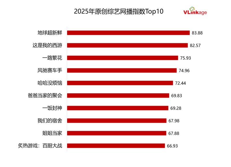 下图为2025年原创综艺网播指数Top10,《地球超新鲜》以83.88的网播指数居冠。在综艺市场,网播指数80+的节目寥寥无几,《地球超新鲜》凭借超高网播指数跻身今年原创综艺Top1。