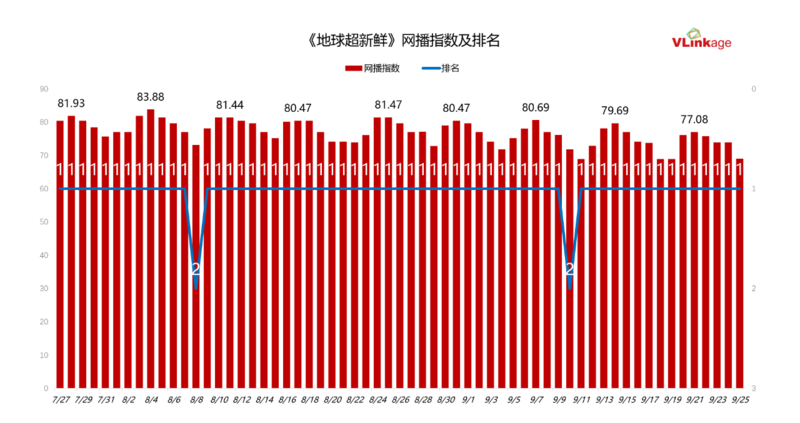 《地球超新鲜》开播以来的热度走势,更加证实了这档综艺节目的超强受众影响力。下图可见,自开播后,节目高开高走,在两个月的播出周期里,其中59天稳居V榜综艺榜榜首,是近三年日榜冠军数量最多的原创节目,也是近三年日榜冠军次数第二的综艺节目,仅次于由同一团队打造的《现在就出发第二季》。如此高量级的热度累积背后,是节目用持续精彩的内容留住了庞大的受众。