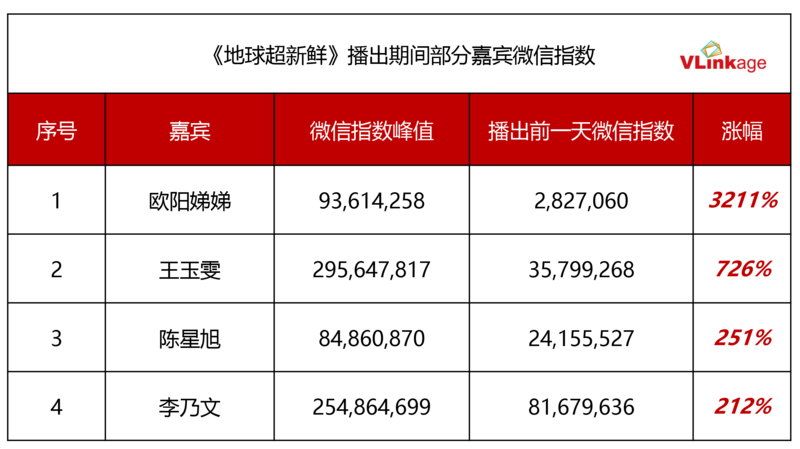 节目的高热度、受众的高满意度,以及社交平台不断发酵的出圈名场面,不仅让节目深入人心,也拉升了嘉宾的全网热度。下图为部分嘉宾微信指数峰值涨幅,比如因“虎妞”性格让观众惊艳不已的王玉雯、因“反差萌”而带来不少爆笑名场面的李乃文、小太阳般明朗可爱的欧阳娣娣、在节目中从i人向e人蜕变的陈星旭等等,这些“综艺新人”因讨喜的真实个性流露,在社交平台人气大涨。