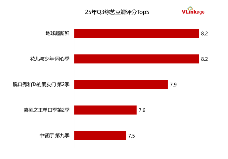 下图为《地球超新鲜》的口碑表现,可以看到,在2025年Q3的综艺节目里,豆瓣开分8.0分、并持续上涨至8.2分的《地球超新鲜》,不仅是今夏受众覆盖最广的综艺,也是同期口碑最佳的节目。