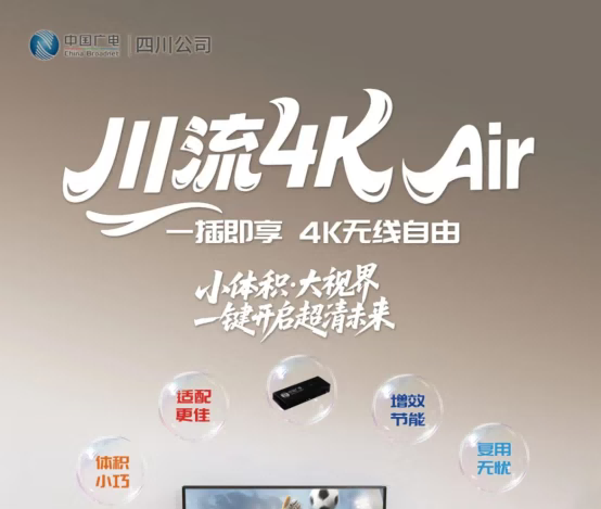 中国广电四川公司发布插入式微型机顶盒-川流4K air插入式微型机顶盒,一插即享4K无线自由。