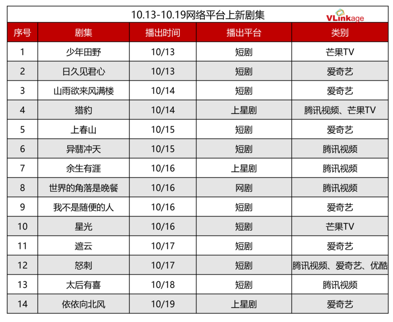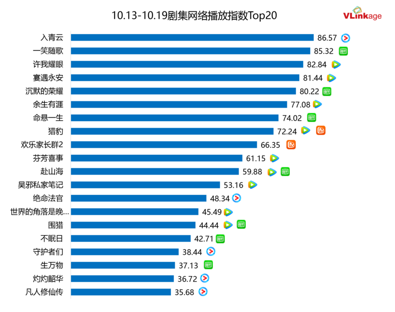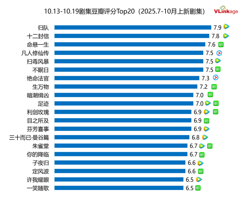 下图为今年下半年剧集豆瓣评分Top20,上周有三部作品豆瓣开分并进入榜单,分别为豆瓣评分7.6分的悬疑剧《命悬一生》,同为6.5分的现偶剧《许我耀眼》和古偶剧《一笑随歌》。