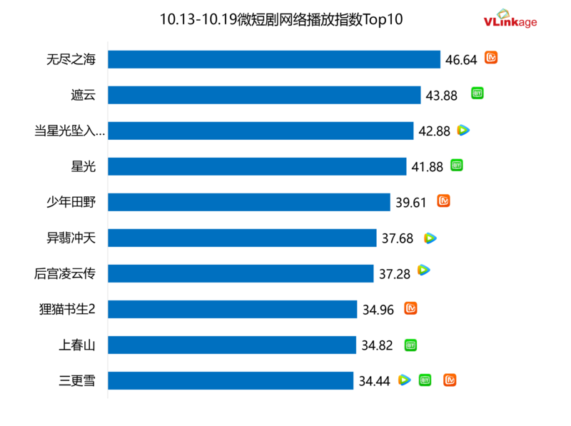 下图为上周微短剧网播指数Top10,上周有4部微短剧网播指数在40+。其中开播进入第二周的《无尽之海》热度最高,新剧《遮云》和《星光》上线首周热度同样表现出色,同在40+量级的还有一部《当星光坠入花海》。