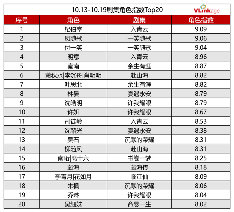 下图为上周剧集角色指数Top20,观众认知度最高的角色为《入青云》男女主纪伯宰和明意,《一笑随歌》男女主凤随歌和付一笑,这些来自热门古偶剧的角色,在年轻受众里有着较高关注度。