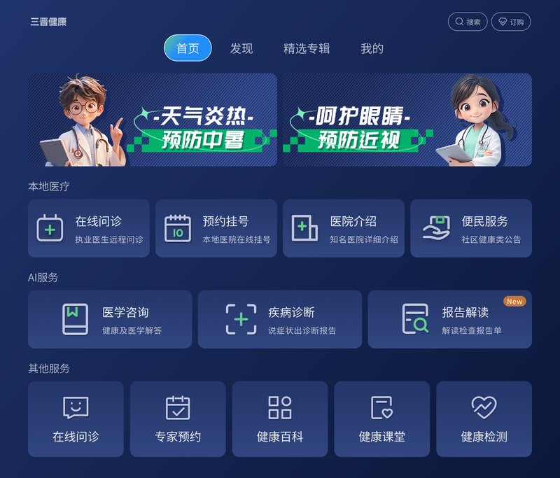 山西电信目前已经通过IPTV大屏,让用户足不出户即可实现沉浸式AI医生服务+在线医生视频问诊服务+健康数据管理服务,医学养生知识的科普教育,推进全民健康素养的提升,让每个用户成为自我健康管理的第一责任人,大屏是家庭的共享屏幕中心,居家沉浸式享受服务的完美体验形式,我们的目标是以居家康养为重心,让疾病生于未有,止有未乱,防患于未然。