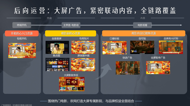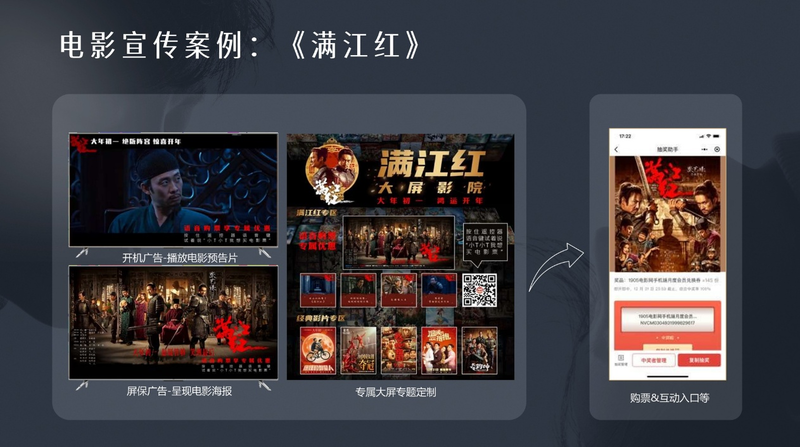 院线营销—让大屏参与片方营销宣传。全国大屏联动+海量用户基础+灵活推荐模式,为影片提供推荐位宣传、深度专题策划、用户观影活动与口碑提升服务。更靠近观众的大屏媒体,结合一键在线订票的转化后链路,为影片票房长红无限助力。