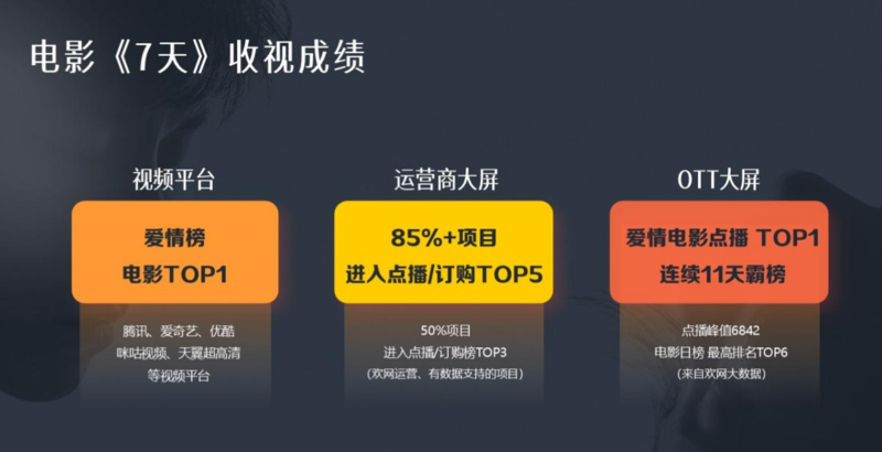 在前向层面,欢网通过精细化内容运营,最大化影片在IPTV端的观看效应与直接收益。以小众电影《7天》为例,通过精准宣、发节奏把握,和运营商平台的紧密配合支持,最终取得优异的榜单成绩。