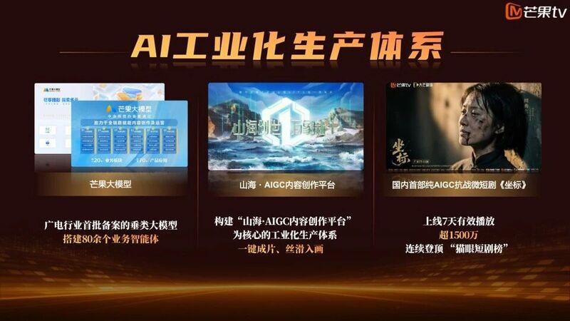 芒果TV自主研发广电行业首批通过中央网信办备案的垂类大模型——芒果大模型,基于此搭建 80 余个业务智能体,全面覆盖内容创作、运营推广与商业化等环节,实现技术与业务深度协同。依托该大模型,芒果TV构建以“山海・AIGC内容创作平台”为核心的工业化生产体系,支持“一键成片、丝滑入画”,显著提升内容生成效率与质量。国内首部纯AIGC抗战微短剧《坐标》便是典型实践,仅投入10万元算力成本,播出期间累计播放量突破1500万,且连续登顶猫眼短剧榜,为行业“技术降本+质量提质”提供可参考样本。