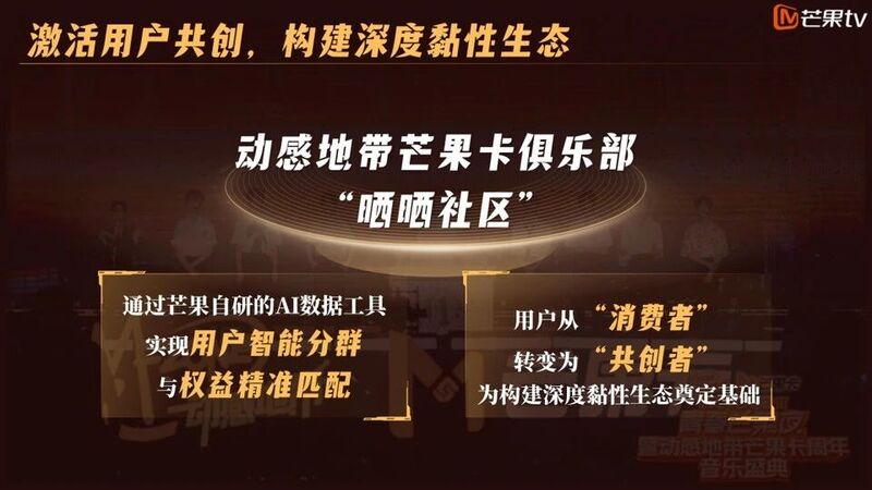 借助芒果自研的AI数据工具,实现用户智能分群与权益精准匹配,提升年轻群体的社交黏性与活跃度,推动用户从 “消费者” 向 “共创者” 转变,为构建深度黏性生态奠定基础。