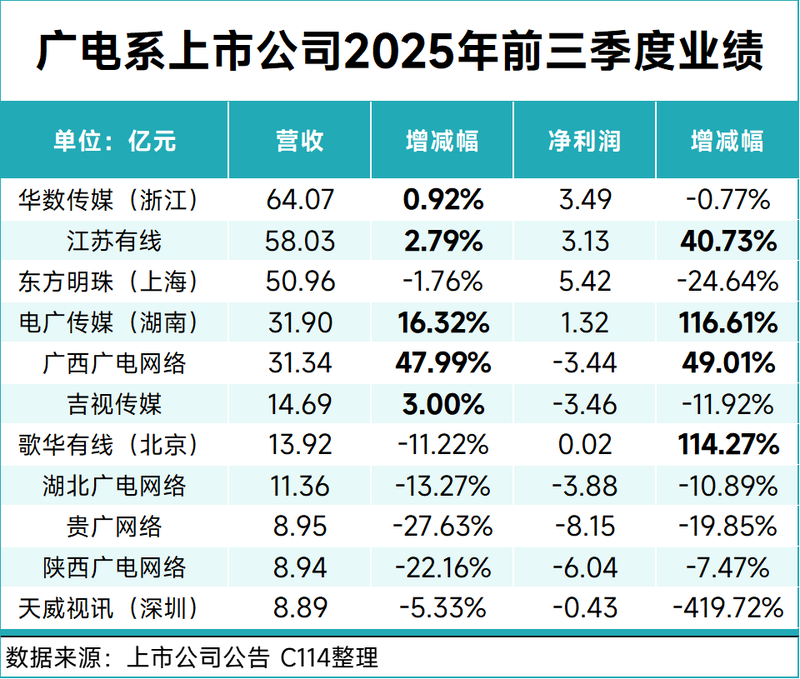 江苏有线(+2.79%)、吉视传媒(+3.00%)、华数传媒(+0.92%)保持微增或基本持平,展现了相对稳定的经营能力。