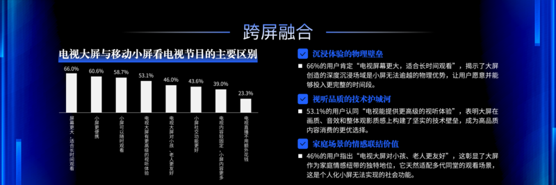 第一是“沉浸体验”,66%的用户觉得“电视屏幕更大,适合长时间观看”——小屏适合碎片化刷视频,但看电影、追长剧,大屏的沉浸感是小屏比不了的;第二是“视听品质”,53.1%的用户认可“大屏有更高级的视听体验”,高清画质、立体音效,能带来更专业的娱乐感受;第三是“家庭适配”,46%的用户觉得“大屏对小孩、老人更友好”——孩子看动画不伤眼,老人看新闻不用眯着眼,这种全龄友好的属性,是个人化的小屏很难实现的。