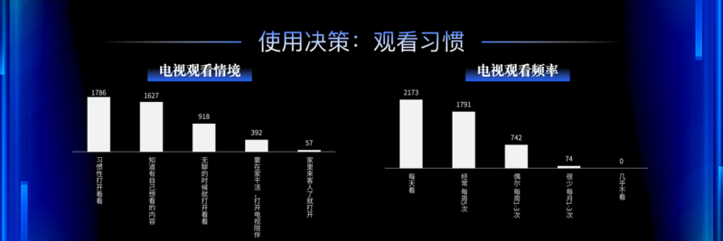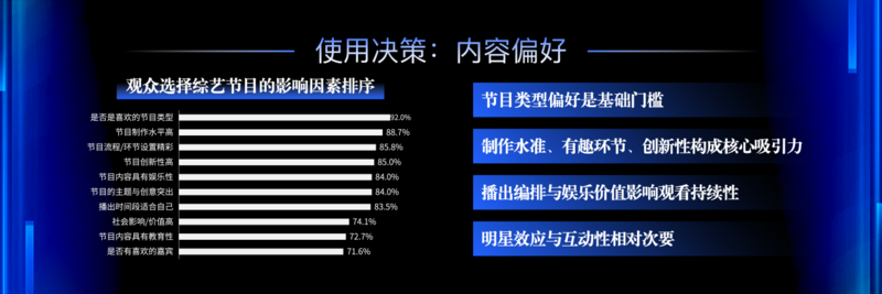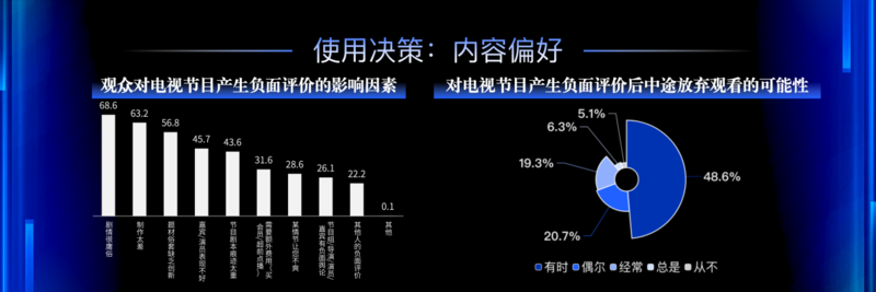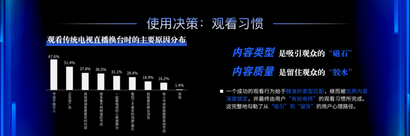 换台决策则围绕“内容”展开:56.8%的用户因“是自己喜欢的内容类型”而持续观看,67.6%的用户因“节目不吸引人”而换台,这说明“内容类型”是吸引观众的“磁石”,“内容质量”是留住观众的“胶水”。