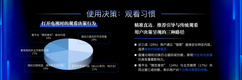 从吸引用户打开电视的决策来看,近三成用户通过“搜索”直接定位内容;四成用户依赖直播与随机切换,传统电视直播的影响力不容忽视;还有三成用户参考平台“猜您喜欢”(14%)与主页推荐(17%),表明算法推荐的影响力正在提升。