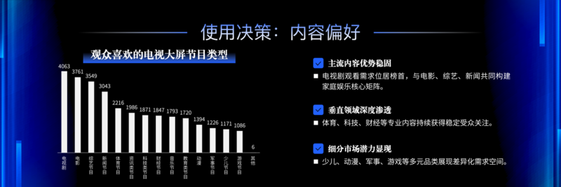 节目类型选择上,电视剧(4063人)、电影(3761人)、综艺节目(3549人)、新闻节目(3043人)位居前列,构成家庭娱乐核心矩阵;体育(2216人)、科技(1871人)、财经(1847人)等垂直领域内容获得稳定关注;少儿(1171人)、动漫(1394人)、军事(1226人)等细分品类也展现出差异化需求空间。