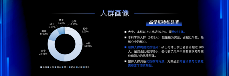 在学历层面,高学历特征尤为显著。大专、本科以上学历用户占比接近85.8%,其中本科学历用户达2439人,占据样本总数的近半数,是绝对核心。这为高品质内容消费与付费意愿奠定了坚实基础。