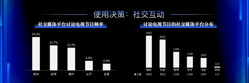 此外,社交媒体也深度嵌入电视大屏观看旅程:超八成用户会在社交媒体讨论电视节目,其中微信(3442人)、抖音(3023人)是核心阵地;73.3%的用户认为社交媒体信息对节目选择“有一些影响”或“很大影响”,78.4%认为相关信息“有用”或“非常有用”;78.7%的用户“愿意”或“非常愿意”参与节目社交互动——这意味着,电视大屏与移动小屏正加速跨屏融合,形成“观看-讨论-参与”的完整闭环。