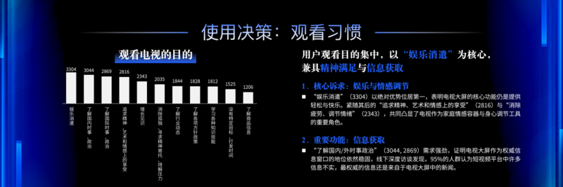 从观看目的来看,用户需求高度集中:3304人以“娱乐消遣”为核心目的,2816人追求“精神、艺术和情感上的享受”,2035人希望“消除孤独、排解压力”,三者共同凸显电视大屏作为“家庭情感容器”与“身心调节工具”的角色;同时,3044人通过电视“了解国内时事政治”,2869人关注“国际时事政治”,结合线下访谈中95%的用户认为“电视大屏新闻更权威”的反馈,可见大屏作为权威信息窗口的地位依然稳固。