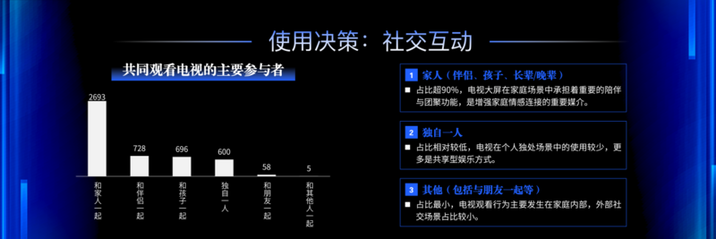 电视大屏的社交互动,核心围绕“家庭场景”展开。从共同观看参与者来看,2693人与“家人一起观看”,728人与“伴侣一起”,696人与“孩子一起”,家人(伴侣、孩子、长辈/晚辈)共同观看占比超90%;独自一人观看的用户仅600人,占比相对较低,可见电视大屏更多是“共享型娱乐方式”,承担着家庭陪伴与团聚功能。