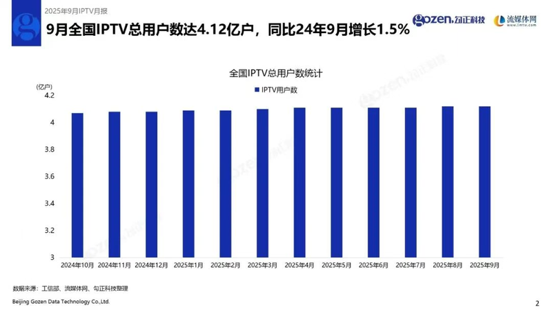 9月全国IPTV总用户数达4.12亿户,同比24年9月增长1.5%。