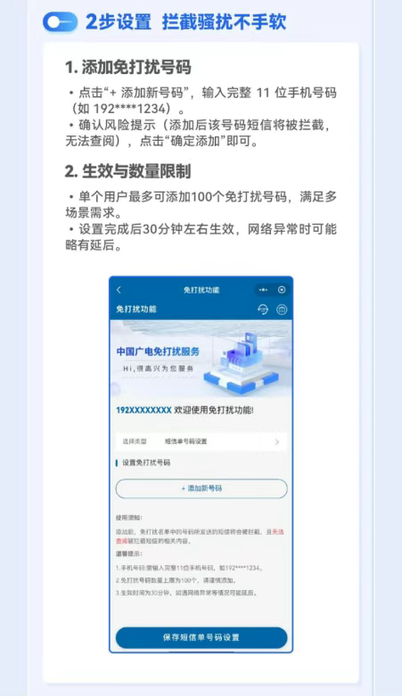 在运营商网络覆盖与资费套餐日趋同质化的背景下,以用户体验和隐私保护为支点的差异化服务,正成为形成竞争优势的重要路径。广电5G将短信免打扰功能与反诈技术相结合,构建了“主动防护+用户自主”的双重服务屏障,为行业提升服务品质提供了有益探索。