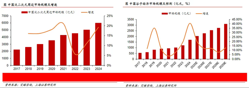 上海证券8月份发布的研报援引艾媒咨询数据显示,中国泛二次元用户规模逐年递增,2023年达4.9亿人,2024年中国泛二次元及周边市场规模达5977亿元。其中“谷子经济”(二次元衍生品经济)市场规模达1689亿元,较2023年增长40.6%,预计2029年规模超3000亿元。