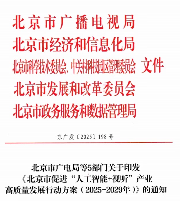 常话短说注意到,在这两天的2025北京国际视听大会上,北京市广电局联合市经济和信息化局等五部门共同发布了一个重要政策——《北京市促进“人工智能+视听”产业高质量发展行动方案(2025-2029年)》,有方向指引,更有资金扶持,值得广电视听的从业者看看。