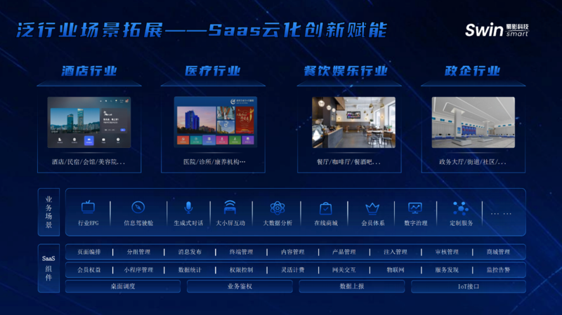 在泛行业场景拓展上,产品结合开放的SaaS云化组件能力,实现了从公众市场到行业市场的横向覆盖。针对酒店、医疗、教育、政企等不同行业,可提供个性化EPG页面编排、专属AI智能体搭建、在线商城与会员体系构建、智能家居IoT设备接入管理等服务。目前已支撑部分省级运营商实现行业大视频业务转型,在酒店、康养机构、政务大厅等场景落地应用,助力运营商稳固行业存量、拓展增量空间。