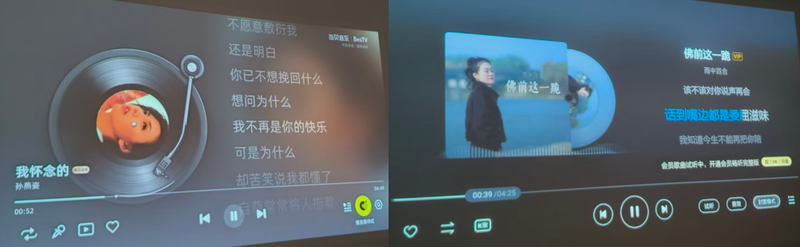 播放器界面简洁,可以用遥控器快进快退、循环播放、收藏、切换MV/K歌等模式,还可切换多种音效。