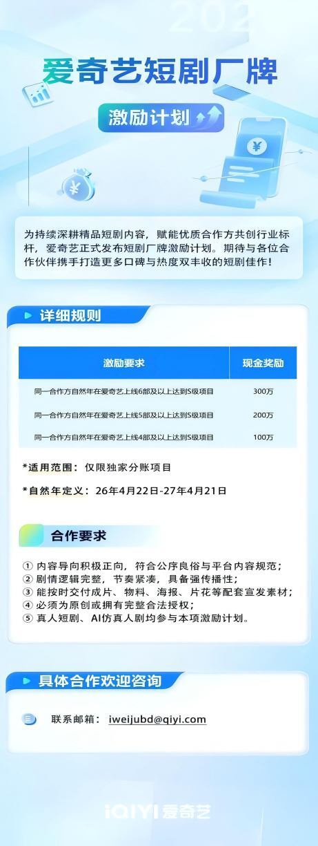 4月21日,爱奇艺发布短剧厂牌激励计划,激励设置三种要求,分别是同一合作方在自然年内在爱奇艺上线4部、5部、6部S级项目,对应的现金激励100万、200万、300万。要求,仅限独家分账项目。