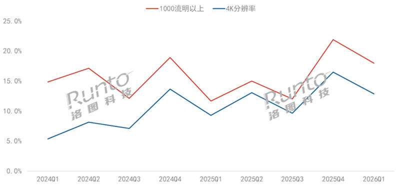 根据洛图科技(RUNTO)线上监测数据显示,2026年第一季度,千流明以上亮度产品的销量份额较2025年同期上涨了6.3个百分点,至18.0%。